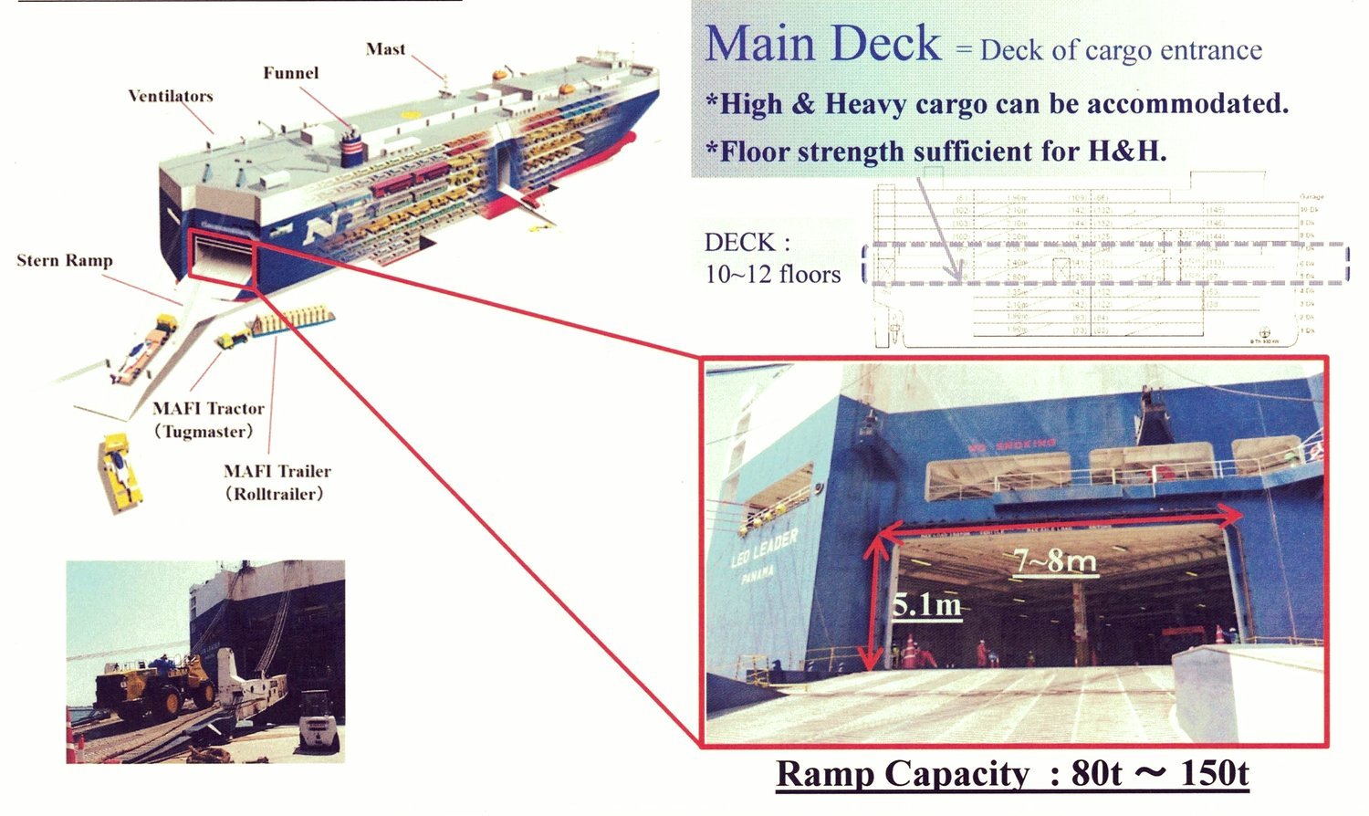 RORO vessels have either built-in or shore-based ramps that allow the cargo to be efficiently rolled on and off the vessel when in port. While smaller ferries that operate across rivers and other short distances often have built-in ramps, the term RORO is generally reserved for large oceangoing vessels. The ramps and doors may be located in stern, bow or sides, or any combination thereof.